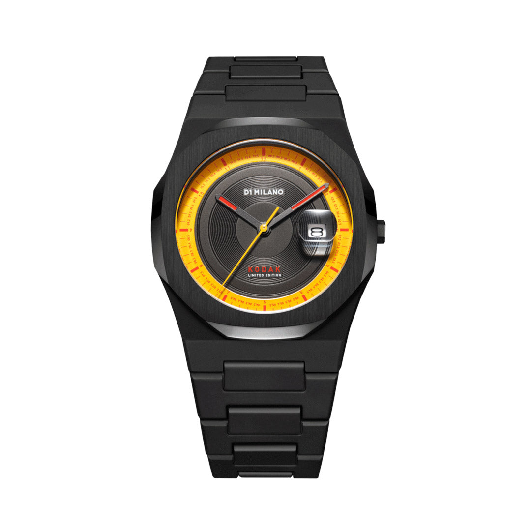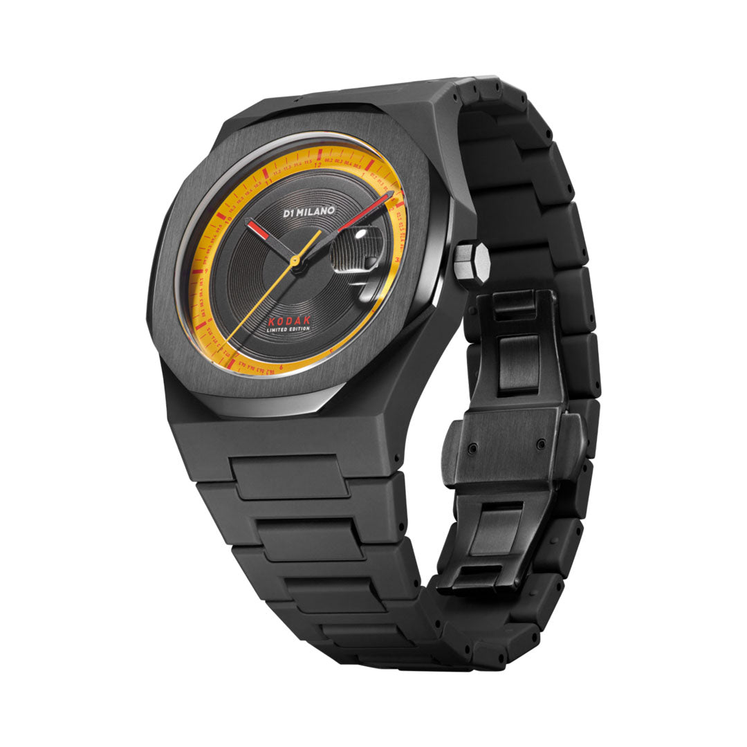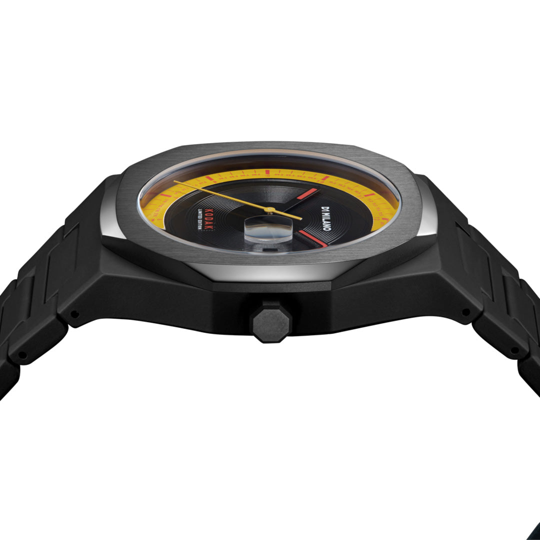 Orologio D3 Kodachrome con cassa di colore nero in polycarbonate e cinturino di colore nero in polycarbonate. Diametro cassa 40.5 mm, spessore 8.8 mm, larghezza cinturino 25 - 17 mm. Movimento seiko vj32b. Resistente all'acqua fino a 5 atm. Quadrante nero con dettagli gialli e rossi. Vetro zaffiro con finitura antiriflesso blu and cyclop lens at 3h. Fibbia in acciaio inossidabile 316l con chiusura a farfalla nascosta.