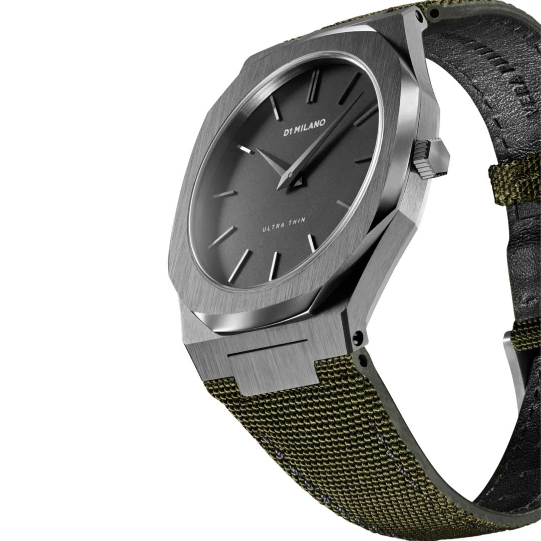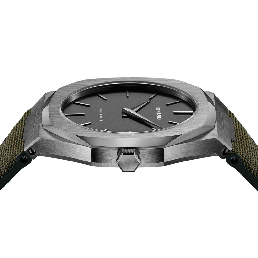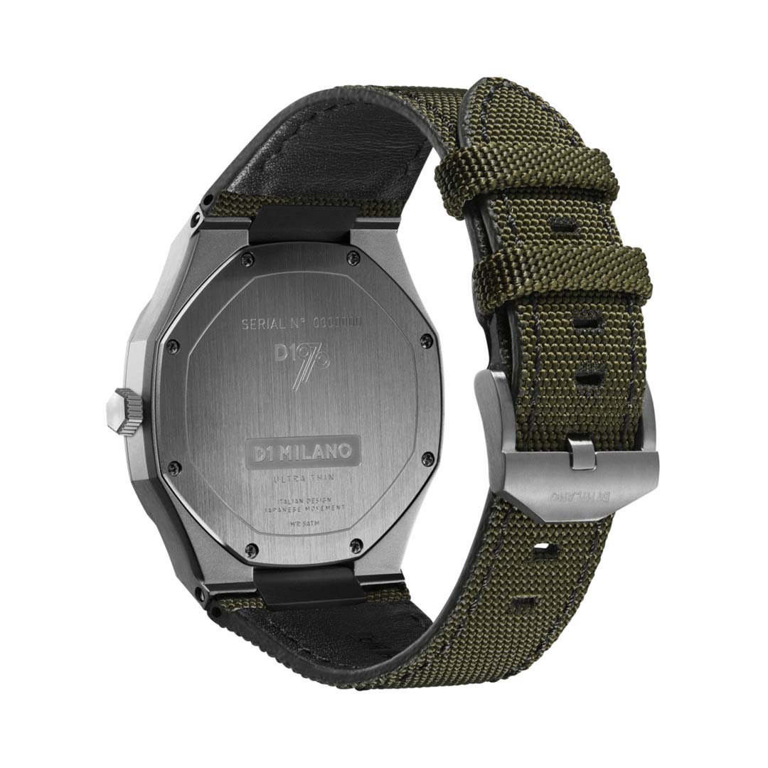Orologio D3 mimetico con cassa di colore canna di fucile in acciaio inossidabile 316l covered in gun pvd e cinturino di colore army verde in nylon with natural leather lining. Diametro cassa 40 mm spessore 7 mm, larghezza cinturini 23 - 16 mm. Movimento CITIZEN MIYOTA 1L22. Resistente all'acqua fino a 5 ATM. Quadrante nero con dettagli canna di fucile. Vetro Zaffiro con finitura antiriflesso blu. Fibbia in acciaio inossidabile 316l covered in gun pvd con chiusura a fibbia a coda.