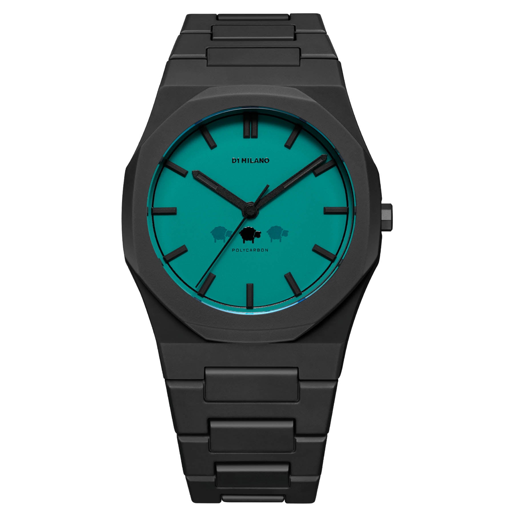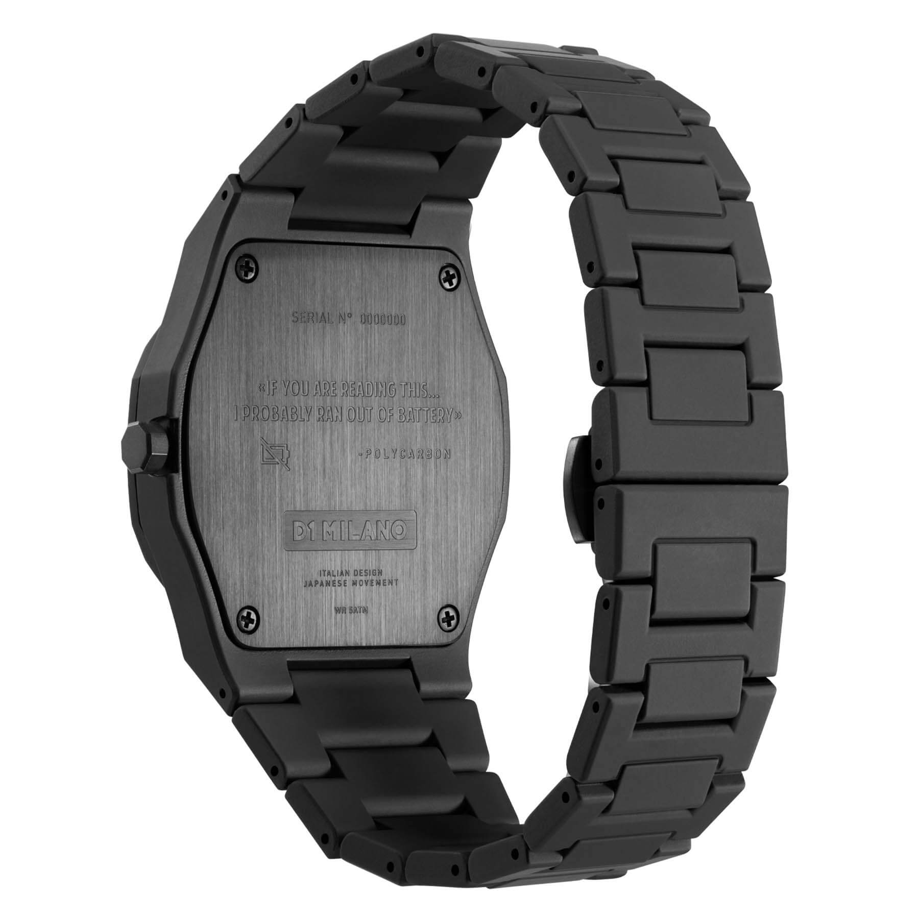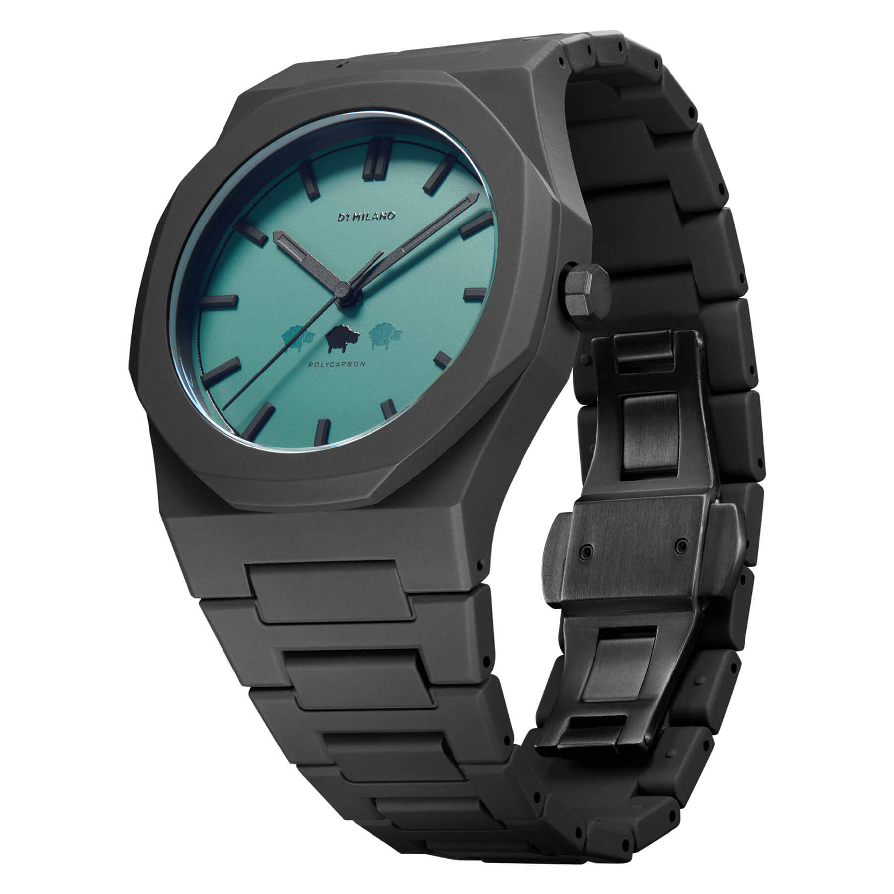 Orologio D1 Milano modello Poly Dolly con cassa di colore nero e cinturino di colore nero in Policarbonato con finitura Soft Touch per dare al materiale una sensazione inaspettatamente morbida e un'incredibile finitura opaca. Quadrante di colore Verde. Diametro cassa 40,5 mm, spessore 8,80 mm, larghezza cintura 23-16 mm. Movimento al Quarzo Seiko VJ21. Resistente all'acqua fino a 5 atm. Vetro in zaffiro con rivestimento antiriflesso blu. Corona, fondello e fibbia sono realizzati in acciaio inossidabile 316L a basso tenore di carbonio con finitura spazzolata o sabbiata.