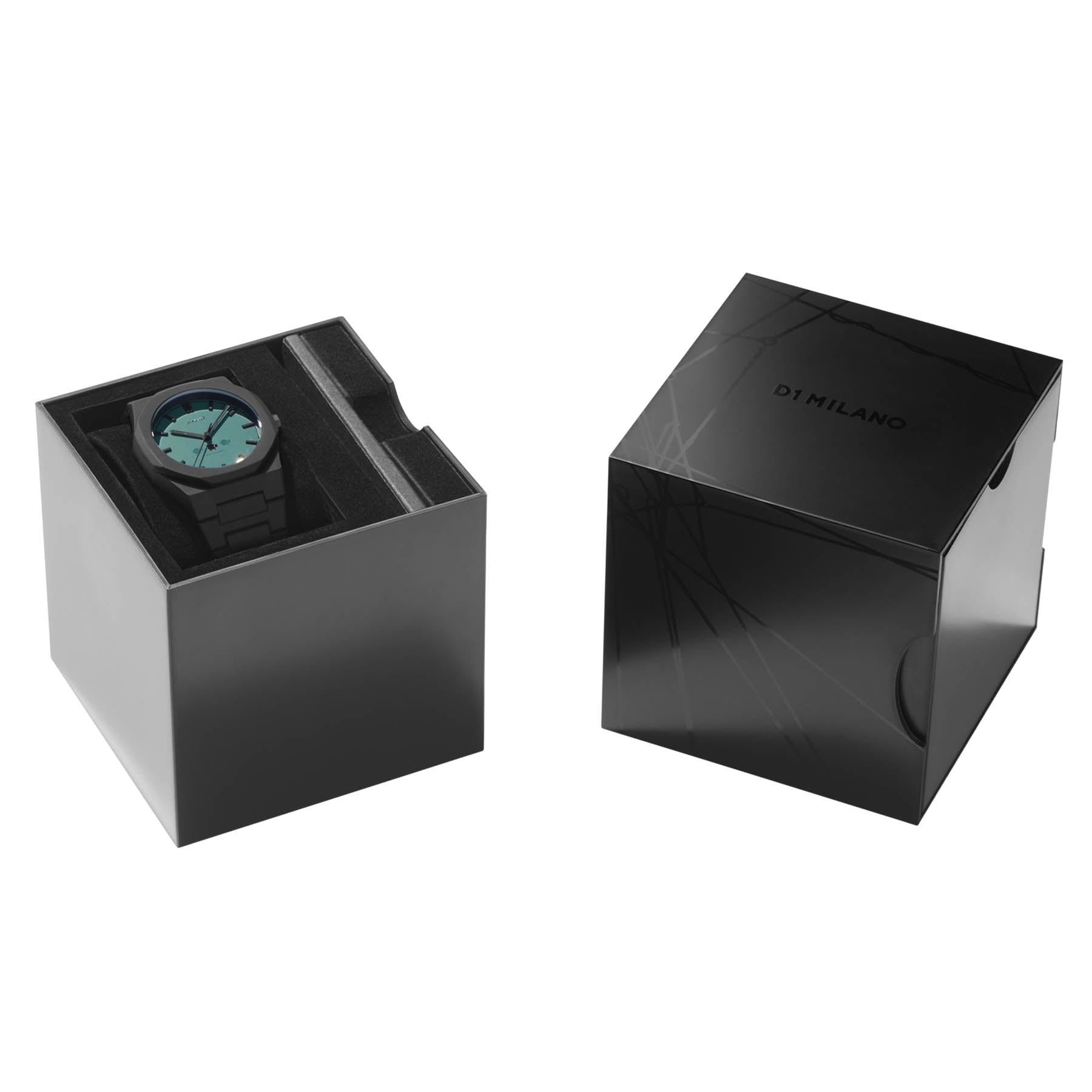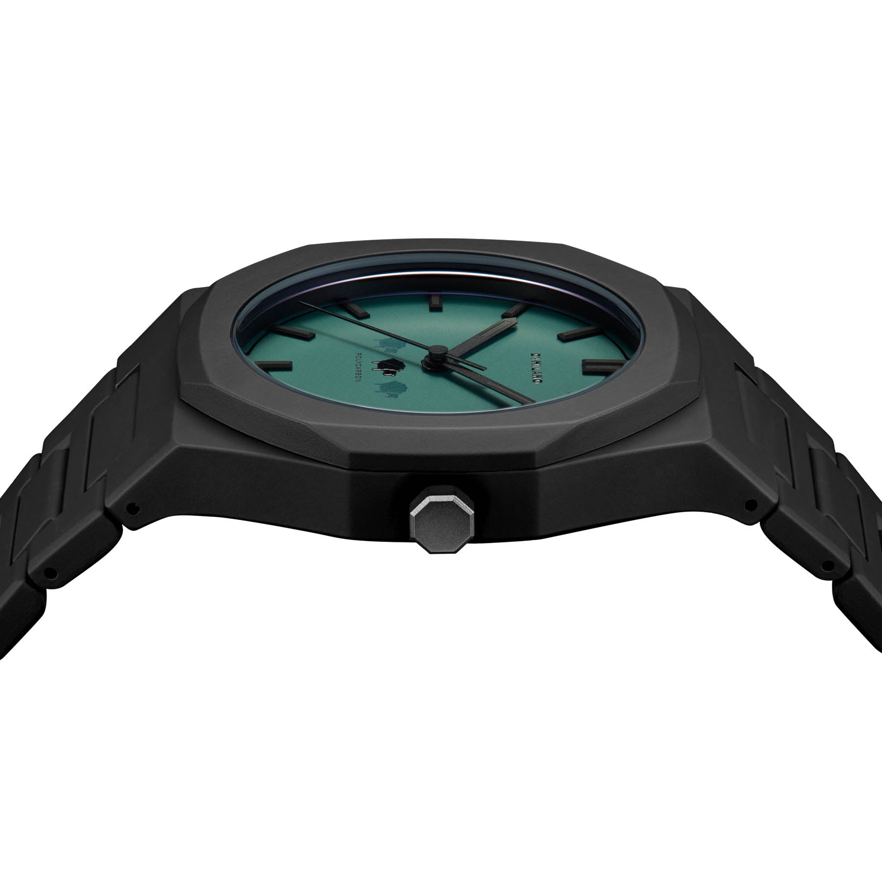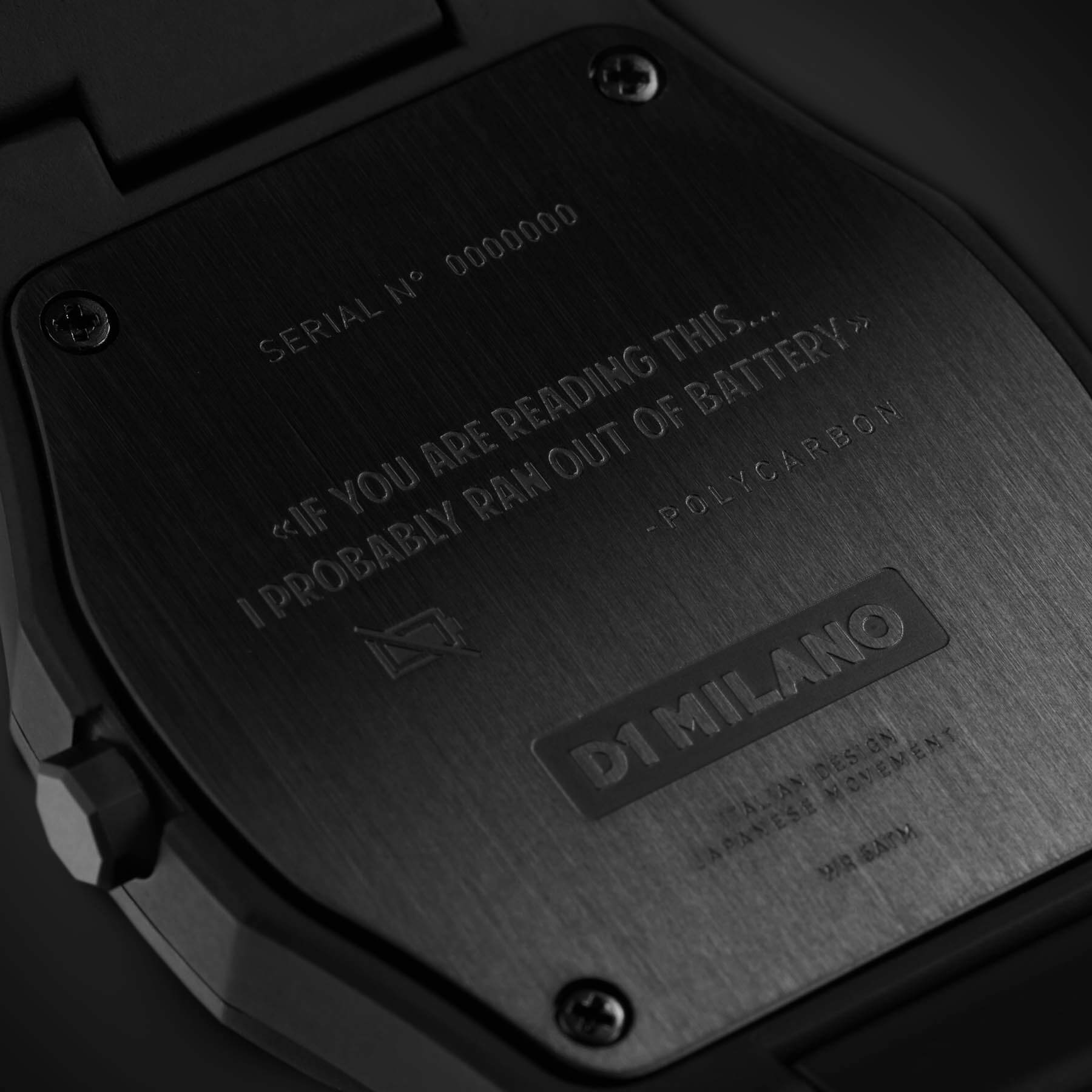 Orologio D1 Milano modello Poly Dolly con cassa di colore nero e cinturino di colore nero in Policarbonato con finitura Soft Touch per dare al materiale una sensazione inaspettatamente morbida e un'incredibile finitura opaca. Quadrante di colore Verde. Diametro cassa 40,5 mm, spessore 8,80 mm, larghezza cintura 23-16 mm. Movimento al Quarzo Seiko VJ21. Resistente all'acqua fino a 5 atm. Vetro in zaffiro con rivestimento antiriflesso blu. Corona, fondello e fibbia sono realizzati in acciaio inossidabile 316L a basso tenore di carbonio con finitura spazzolata o sabbiata.