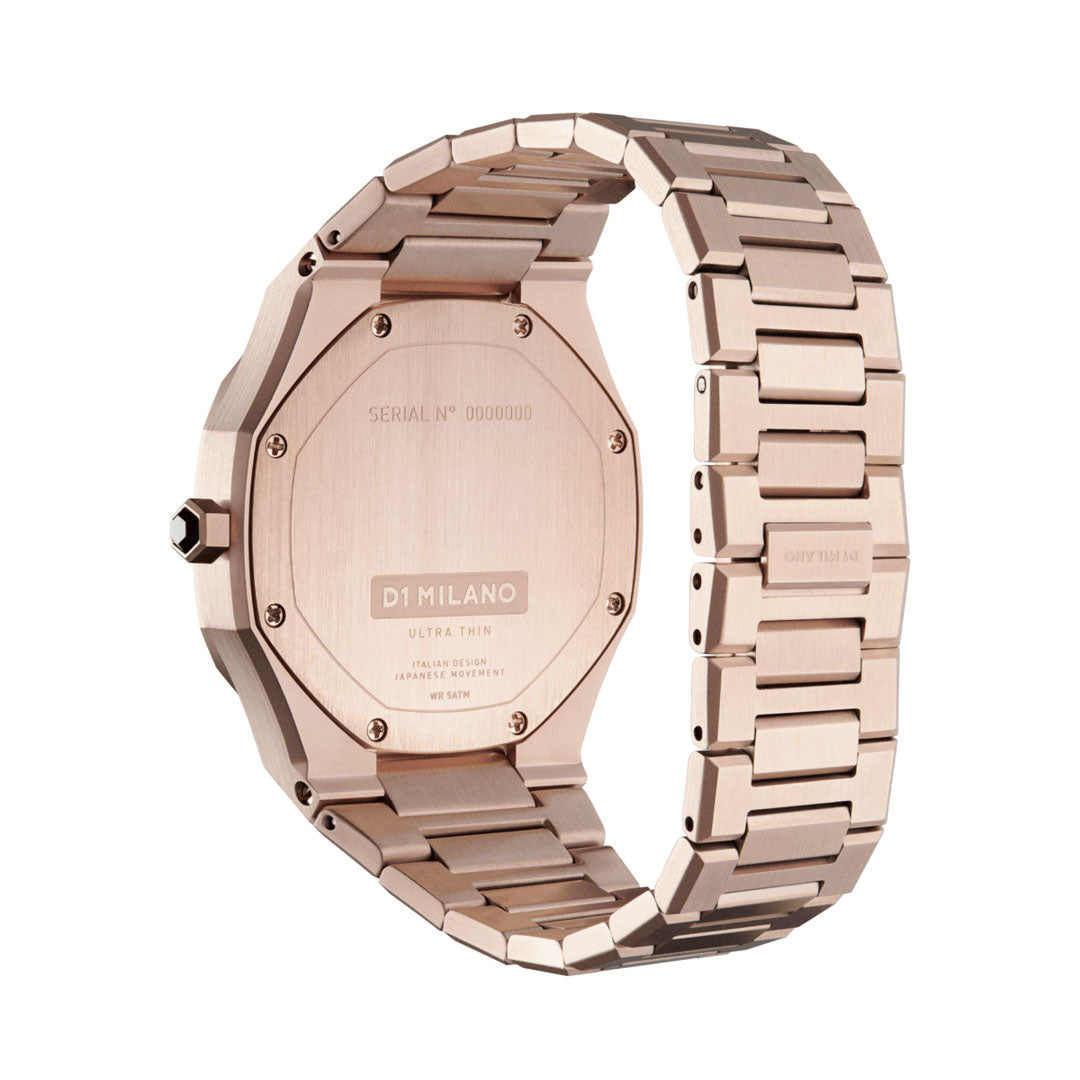 Orologio Rose Cloud con cassa di colore oro rosa in acciaio inossidabile 316l rivestito in oro rosa e cinturino di colore oro rosa in acciaio inossidabile 316l rivestito in oro rosa. Diametro cassa 34 mm, spessore 7 mm, larghezza cintura 21 - 14mm. Movimento citizen miyota 1l22. Resistente all'acqua fino a 5 atm. Quadrante bianco con dettagli oro rosa. Vetro in zaffiro con rivestimento antiriflesso blu. Fibbia in acciaio inossidabile 316l rivestito in oro rosa.