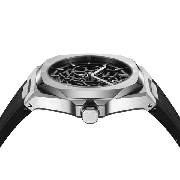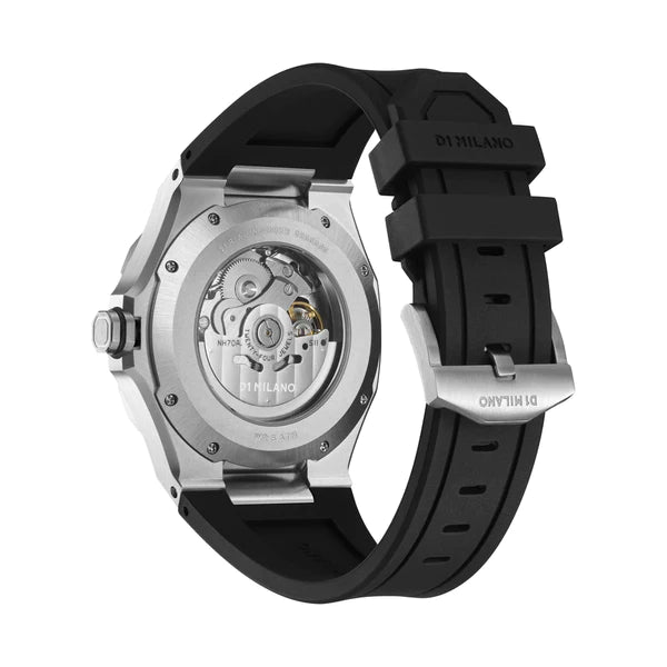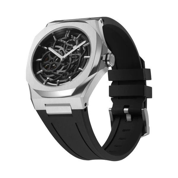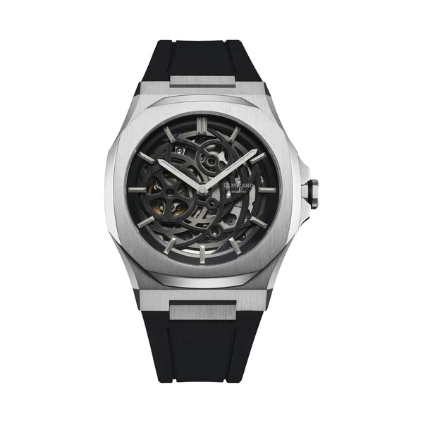 Orologio unisex D1 Milano Skeleton Collezione Mechanical solo tempo, automatico con movimento Seiko SII NH70. Cassa ottagonale in acciaio inox canna di fucile di diametro 41,5 mm e spessore 12 mm. Quadrante rotondo con movimento a vista ed indici applicati canna di fucile. Ghiera in acciaio canna di fucile. Fondello con movimento a vista. Vetro zaffiro con trattamento antiriflesso. Cinturino in gomma nero con chiusura ad ardiglione. WR 5 Atm.