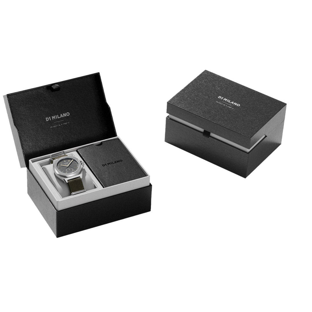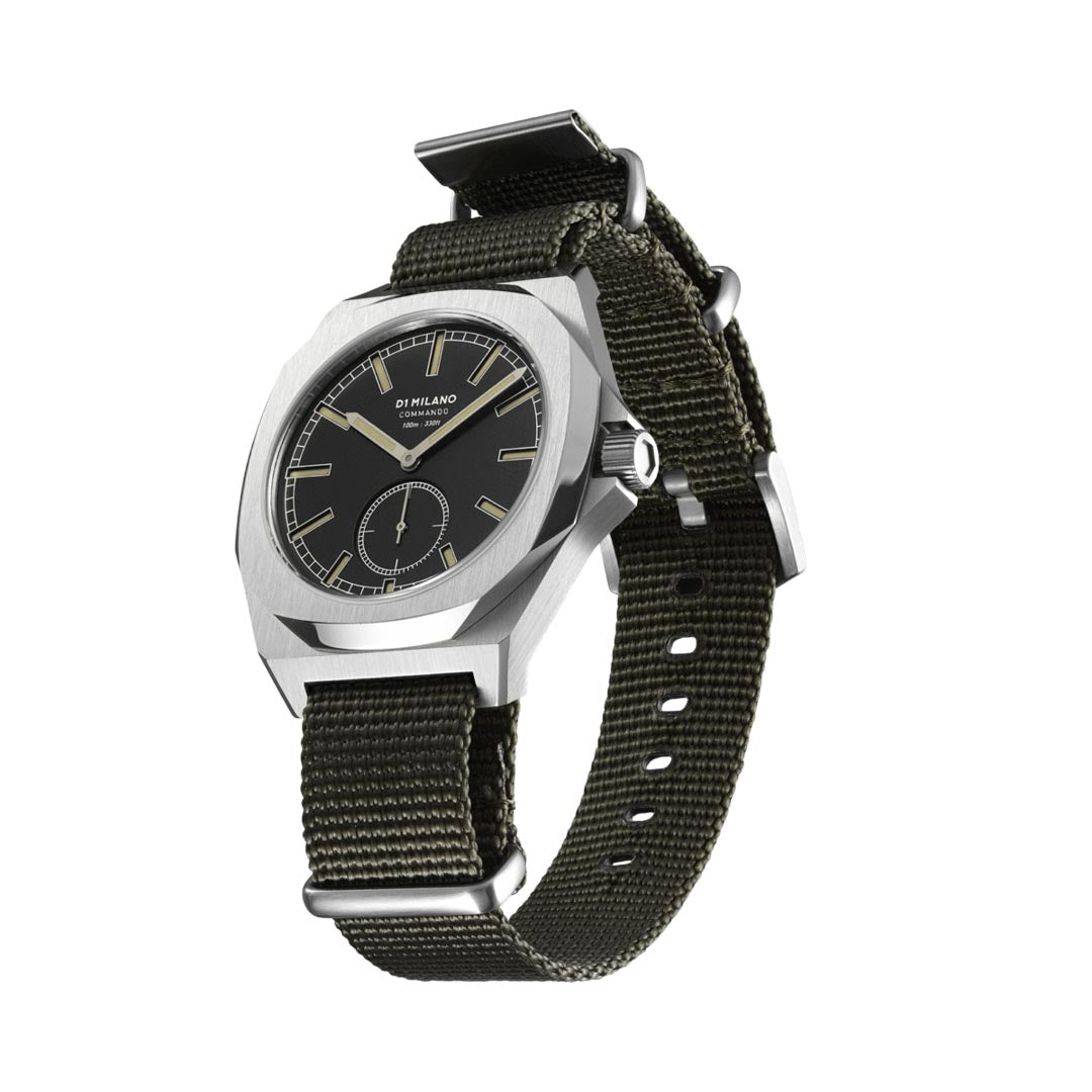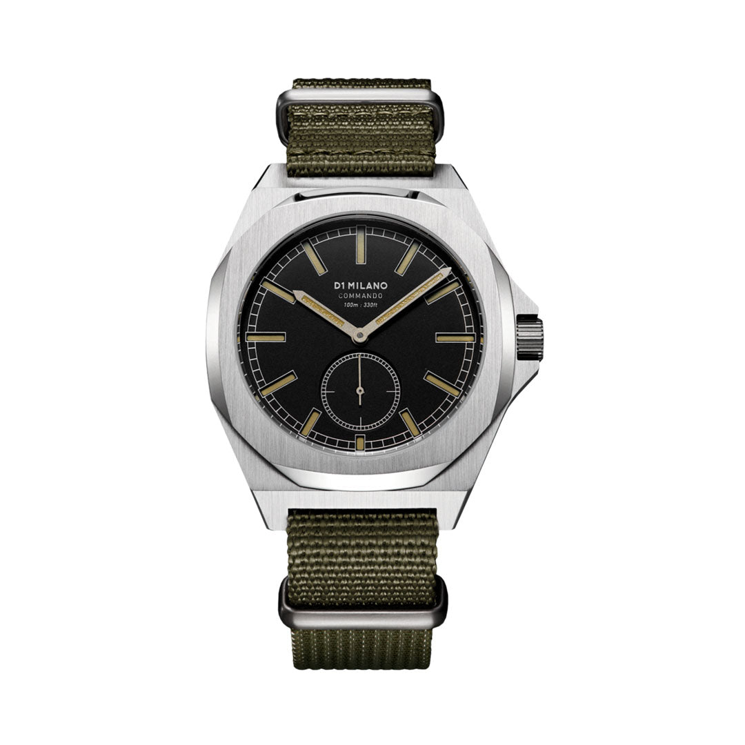 Orologio D3 Tank con cassa di colore argento in acciaio inossidabile 316l e cinturino di colore verde militare in nato strap. Diametro cassa 38 mm, spessore 8.6 mm, larghezza cinturino 18 mm, movimento citizen miyota 1l45. Resistente all'acqua fino a 10 atm. Quadrante nero. Vetro zaffiro con finitura antiriflesso blu. Fibbia a coda in acciaio inossidabile 316l.