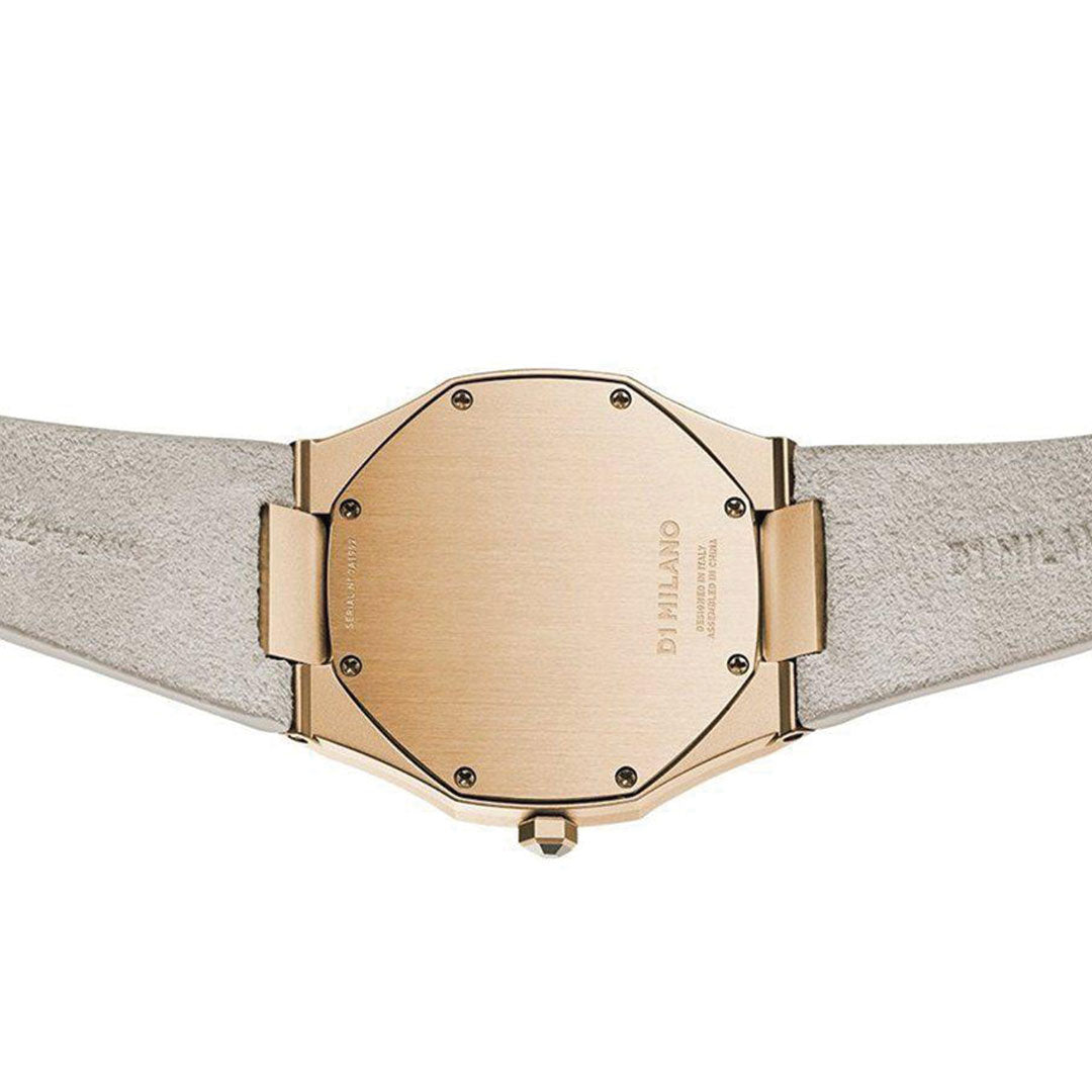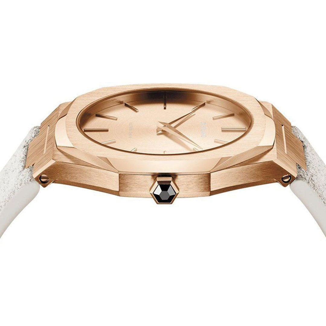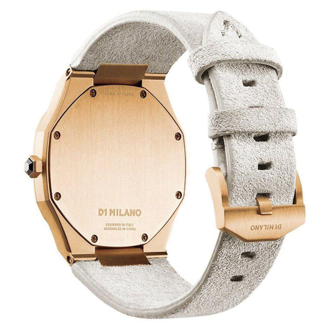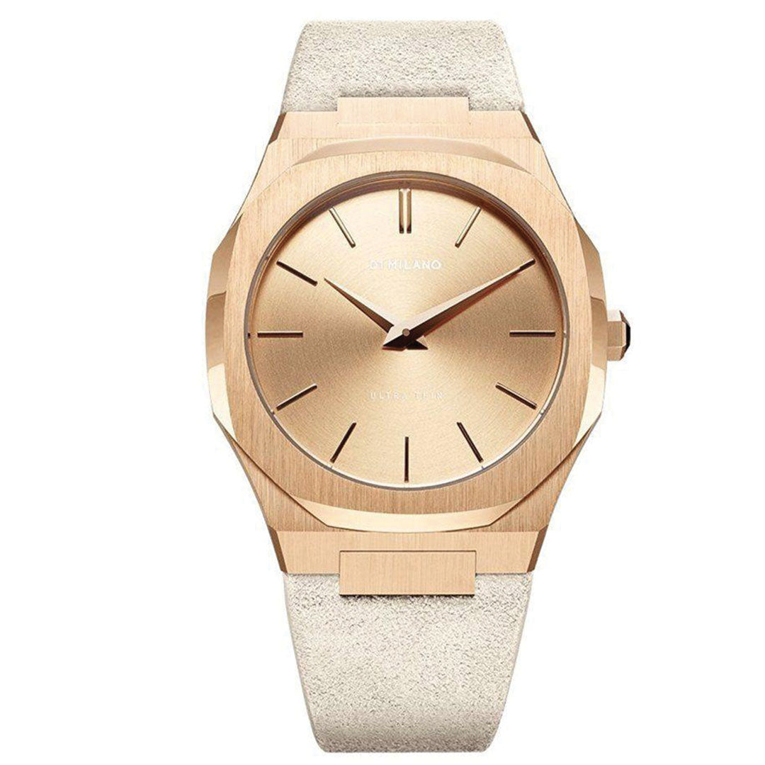 Orologio D3 Ultra Thin gold case with lipari off whitesuede strap con cassa di colore oro giallo in acciaio inossidabile 316l rivestito in oro giallo e cinturino di colore bianco panna in pelle scamosciata di vitello. Diametro cassa 38 mm, spessore 7 mm, larghezza cinturino 24 - 16 mm. Movimento cityzen myota gl20. Resistente all'acqua fino a 5 atm. Quadrante in oro giallo. Vetro in minerale con rivestimento antiriflettente. Fibbia a coda acciaio inossidabile 316l rivestita in oro giallo