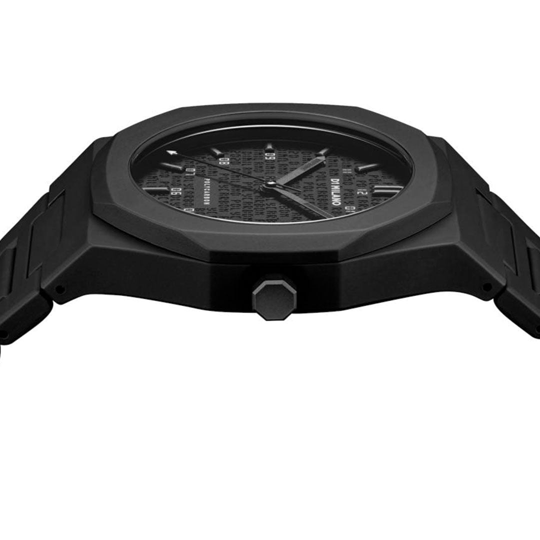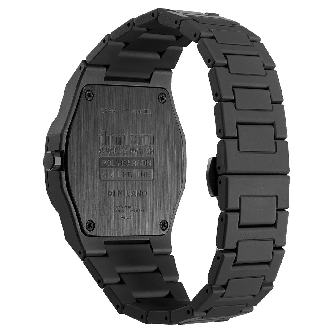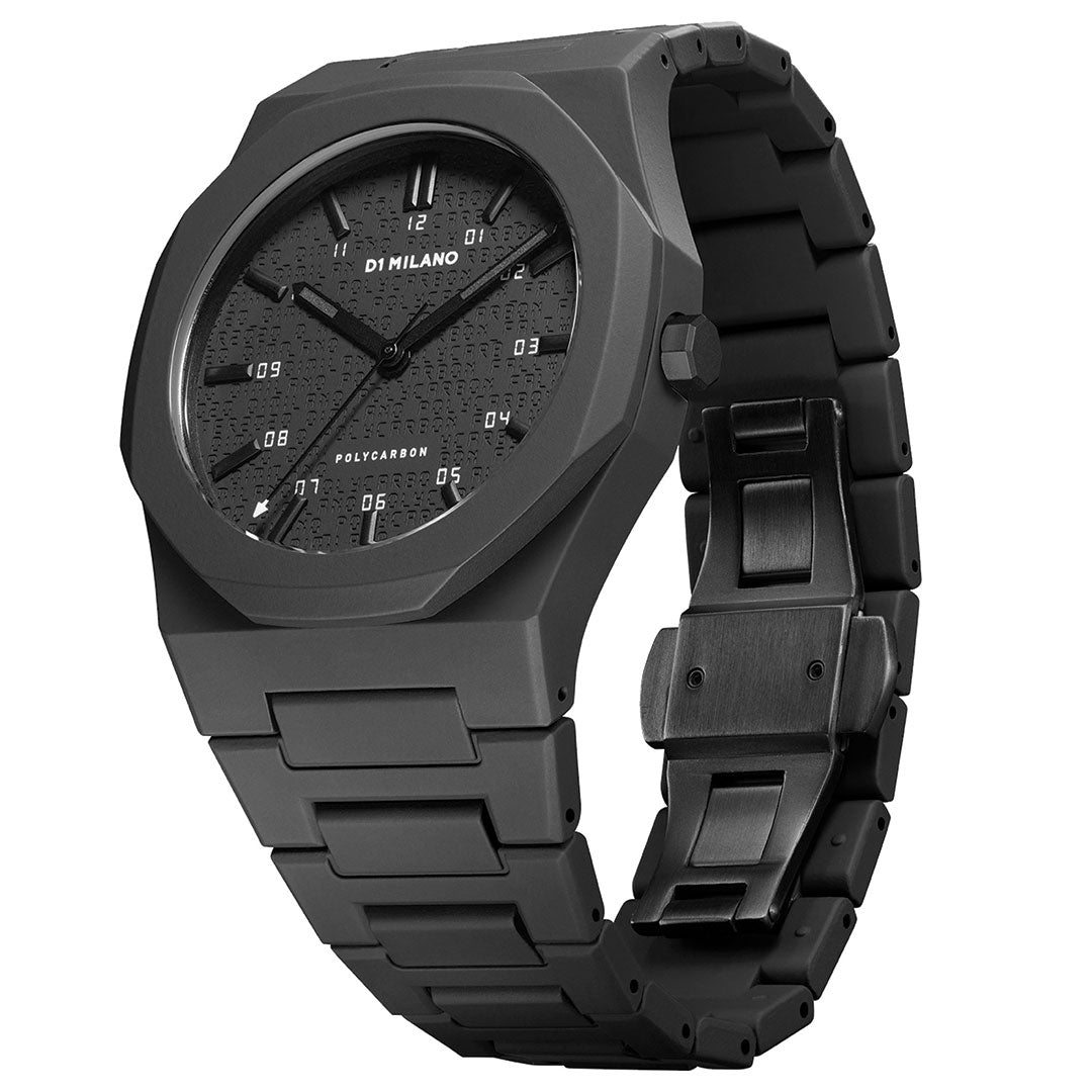 Orologio D3 White Code con cassa di colore nero in policarbonato e cinturino di colore nero in policarbonato. Diametro cassa 40.5 mm, spessore 8.8 mm, larghezza cinturino 25 - 17 mm. Movimento seiko vj21. Resistente all'acqua fino a 5 atm. Quadrante con incisione speciale con dettagli stampati in bianco. Vetro zaffiro con finitura antiriflesso blu. Fibbia in acciaio inossidabile 316l con chiusura a farfalla nascosta.